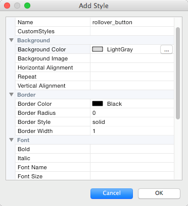 Open the Style Manager (Menu->Format->Styles) and add a new style. Name it 'rollover_button'. Configure the following values: