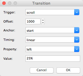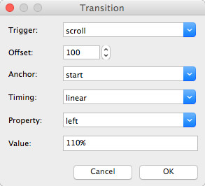 To add scroll transitions, go to the object's animation properties and Click the "add" button in the Transition section.