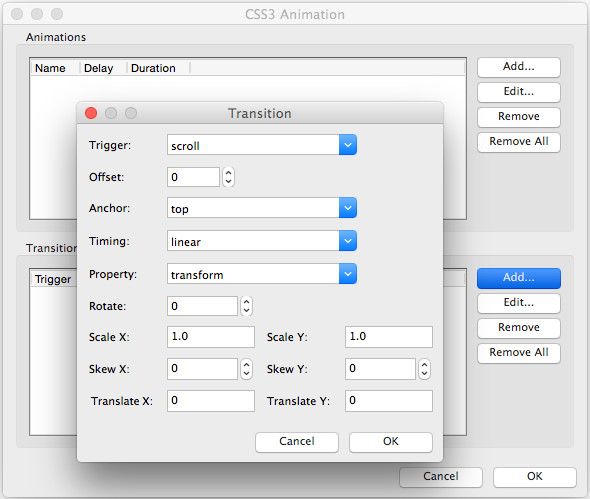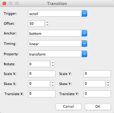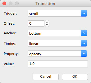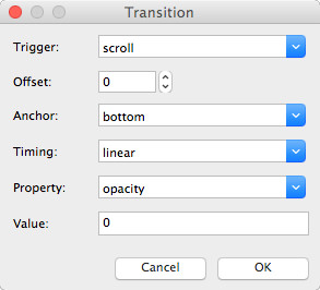 A Scroll Transition (also known as key frame) needs a start and end value, so you will always have at least two entries in the Transitions section. The first key frame defines the begin value of the animation and the second the end value. For example, set the opacity of the object at the start (0) and the end (1) of the animation (fade in based on the scrollbar position). It is also possible to have more key frames for complexer animations.