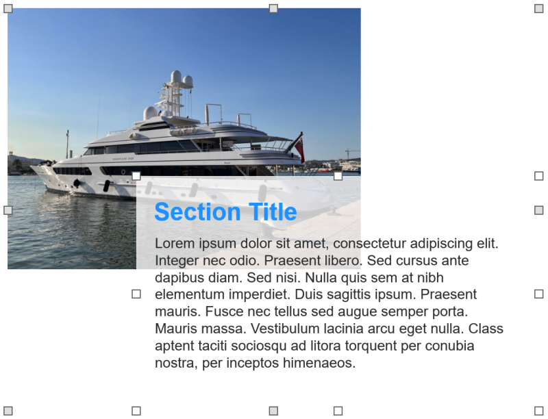 A section is a responsive, self-contained layout container. Sections works the same as Cards, but the main difference is that items can be freely positioned (layered). Self-contained means that all items in the section are embedded in the object itself, they are not separate elements (unlike layers and layout grids). This makes a section lightweight and adds lots of powerful options which normally would be difficult to implement with individually elements.
