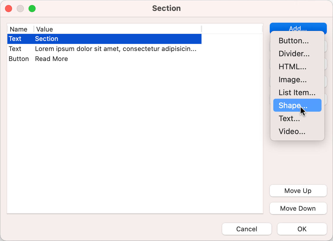 To add a new item, simply click the 'Add' button in the properties and select one of the items: button, text, divider, image, html or video.