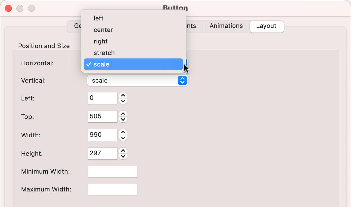 When centered, the item will always be in the horizontal center of the section. This means that you cannot move it horizontally with the mouse. When stretched, the item will automatically resize when the object becomes smaller or larger.
