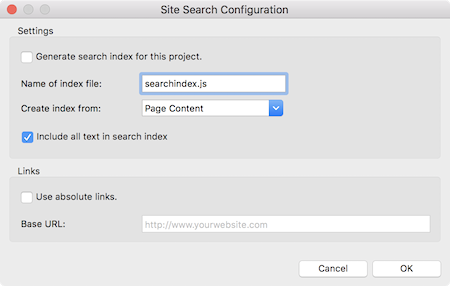 The example for this tutorial the option Include all text in search index is enabled. This will use all text from the page instead of just unique words. Although this will increase the size of the search index, the search results will look better and it makes it possible to search for phrases. Please see the help for more information about the other options.