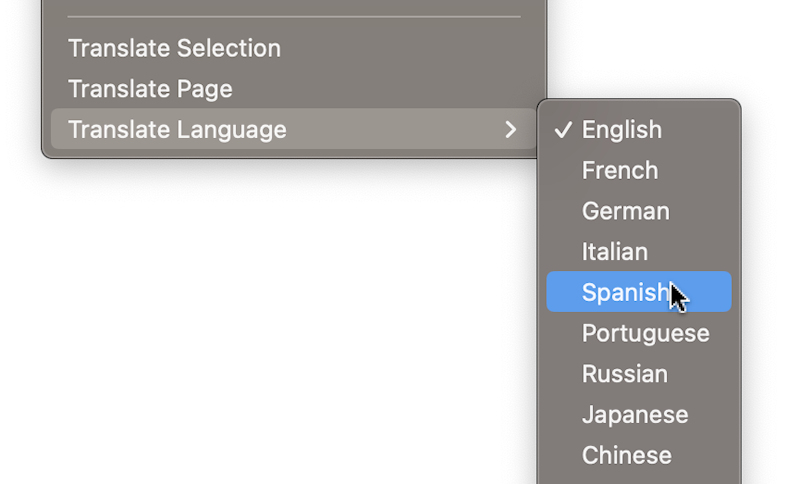 This feature allows you to generate a translated replica of an entire webpage. In contrast to the 'Translate Selection' function, it won't modify the content on the current page. Instead, it generates a new page that maintains the original layout while translating all the text. The new page's name will incorporate the language code corresponding to your selected language. For instance, if you translate 'index' into Spanish, it will become 'index-es'.