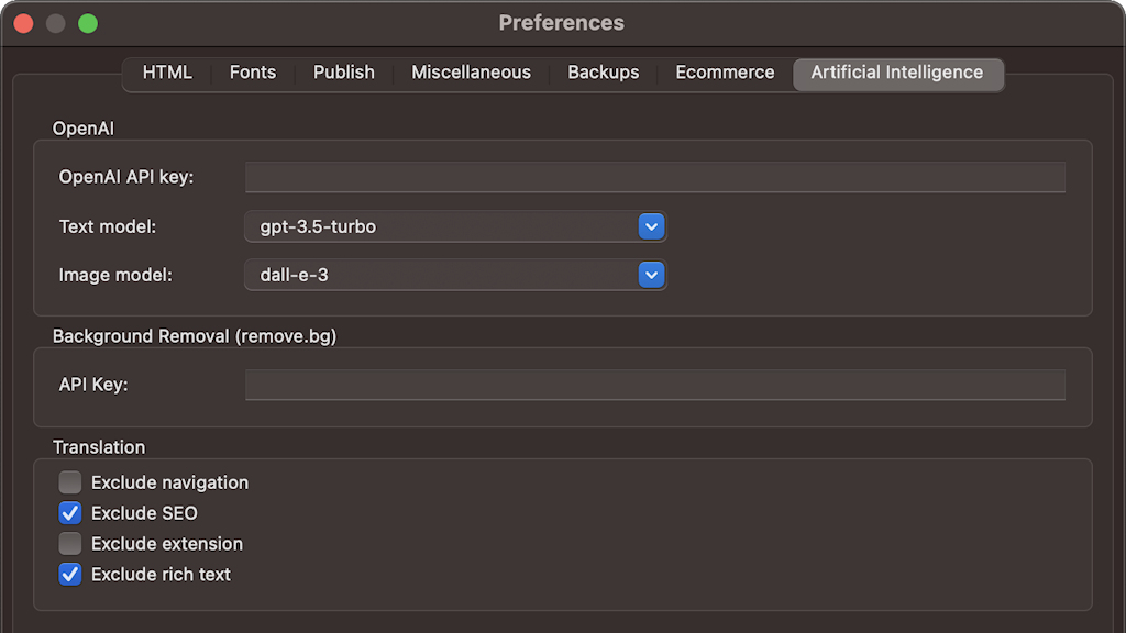 Sometimes you may want to exclude some elements on the page from thew translation. For example, navigation, SEO or extensions. This can be configured in Preferences -> Artificial Intelligence -> Translation.