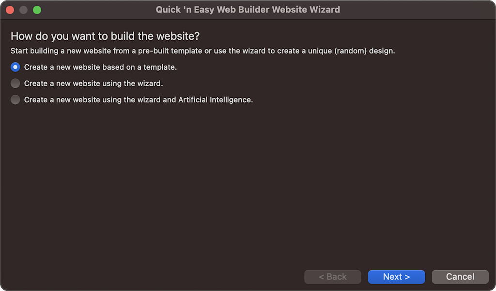 When choosing the "Create a new website using a wizard" option, the wizard will prompt you with a series of questions to determine the desired look and feel of your new website. The resulting website will feature a distinct design, generated based on your selections. Consequently, each time you utilize the wizard, you'll receive a one-of-a-kind website.