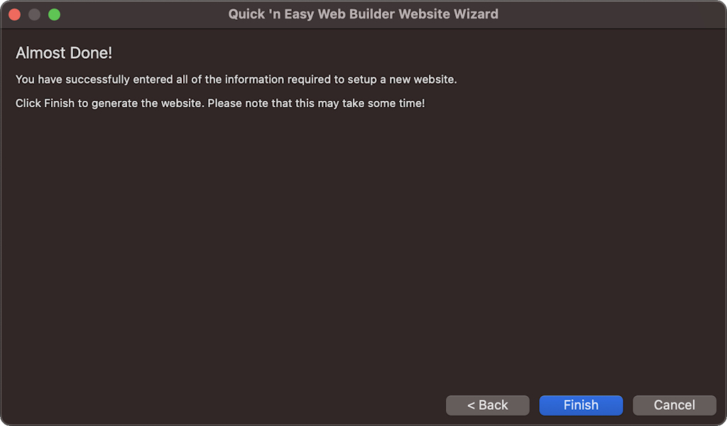 To proceed, click 'Finish' to initiate the website generation process. The duration of this process may vary, depending on the chosen options and the responsiveness of third-party servers. Please be patient while the website is being generated.